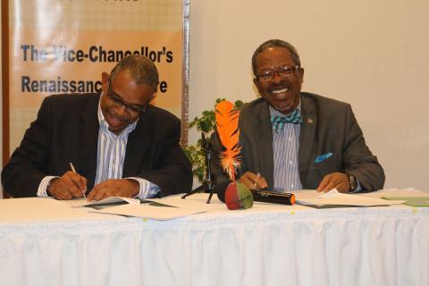 The agreement was signed on behalf of the university by Vice-Chancellor and Principal Ivelaw Lloyd Griffith, and IRP Board Chairman Ian Randle signed on behalf of IRP. The ceremony took place in Herdmanston Lodge, Georgetown, at the end of the presentation of the second Vice-Chancellor’s Renaissance Lecture which was delivered by Mr Randle on The Publishing Pillar of the Renaissance Bridge. Present for the historic occasion was Professor George (Ken) Danns of the University of North Georgia, who accepted the Vice-Chancellor’s invitation to serve as the founding chair of the International Editorial Board of the Press.